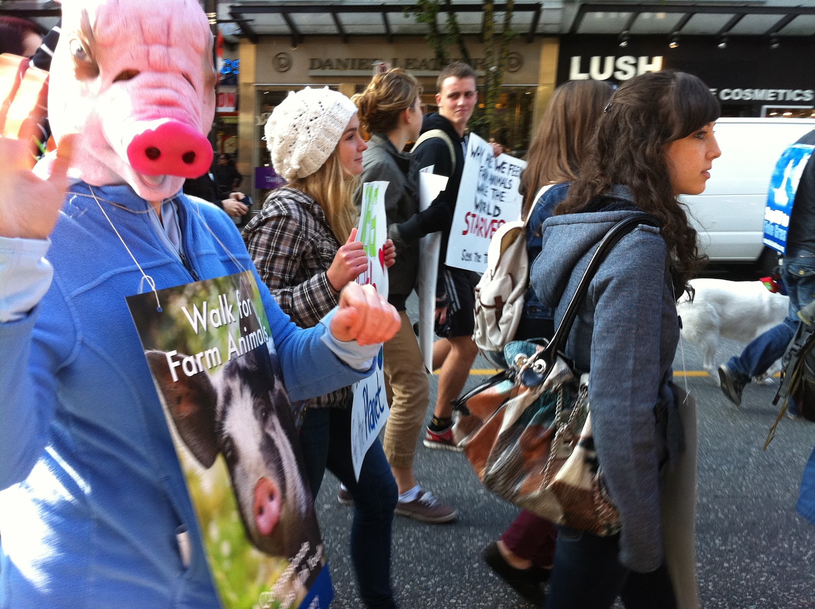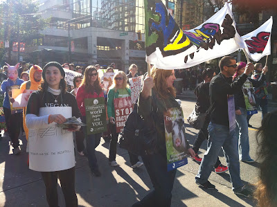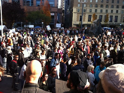 10:30 What a glorious day for a protest! Huge crowd – larger than I anticipated. All ages, not many hippies, mostly smiling folks. Large police presence but mostly jocular types in small groups talking about their Friday night adventures. Heartening to see the ‘human megaphone’ being put to good use.