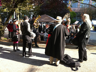 11:00 Leaving the area, I passed half a dozen determined males dressed all in black with the lower half of their faces covered with bandanas heading towards the gathering. They did not look peaceful.